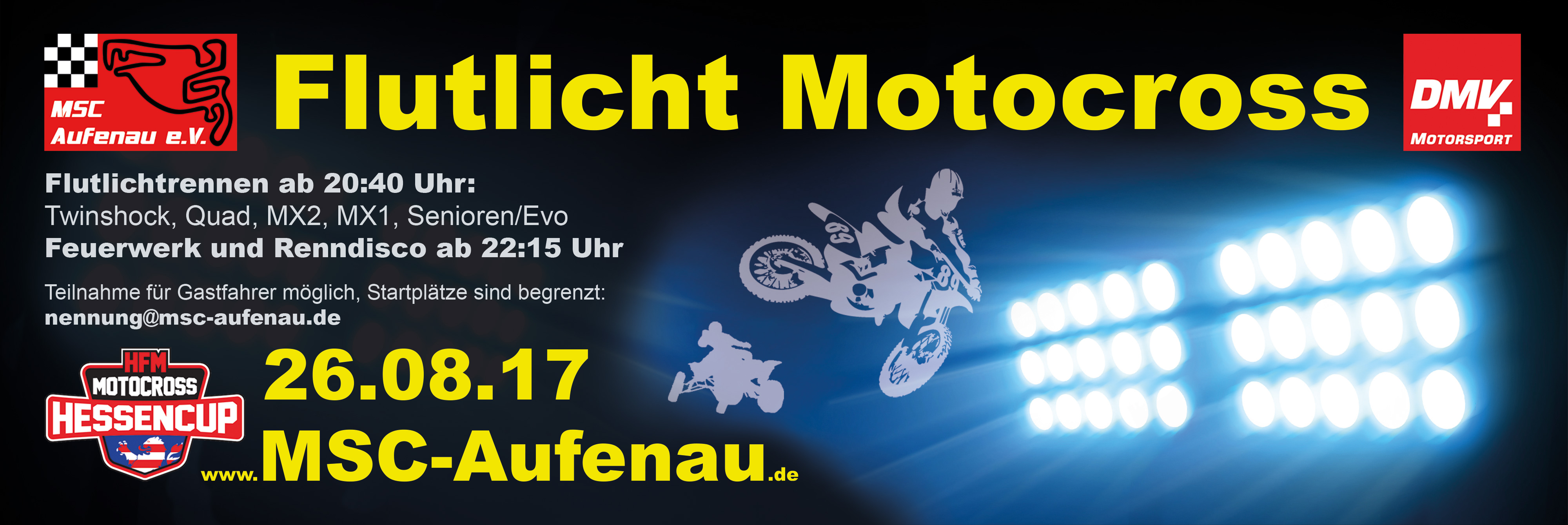Mit Großveranstaltungen kennt sich der MSC Aufenau inzwischen aus. Im Jahr 1998 richtete der Verein erstmals einen Weltmeisterschaftslauf in der 500ccm Solo Klasse aus, 2004 folgte ein Lauf zur Seitenwagen Weltmeisterschaft und zum 50-jährigen Vereinsbestehen im Jahr 2014 standen die 65 und 85 ccm Motocross Europameisterschaften auf dem Programm. Für den 26. August 2017 planen die Mitglieder des MSC Aufenau ihren nächsten großen Coup: Ein Flutlicht Motocross im Rahmen des 2-tägigen MX Hessencups! Die bisher einzige Flutlicht Motocross Veranstaltung Europas findet jedes Jahr beim MSC Kleinhau (nähe Aachen) statt. „Das ist eine sehr erfolgreiche und über 28 Jahre gewachsene Veranstaltung, die wir uns natürlich gewissermaßen zum Vorbild nehmen.“, so Pressesprecher Lukas Schell vom MSC Aufenau. „Trotzdem sehen wir vor allem aus sportlicher Sicht noch Verbesserungspotential; mit den schnellsten Hessencup Klassen MX1, MX2, Quad sowie mit der Twinshock Klasse für klassische Motorräder können wir bei unserer Veranstaltung ein sportlich sehr abwechslungsreiches Programm bieten.“